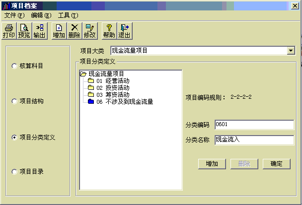 三、 項目分定義:因為用友財務軟件的特殊性,在項目分錄定義中,需要增加類似圖中06、0601、0602的三個分類