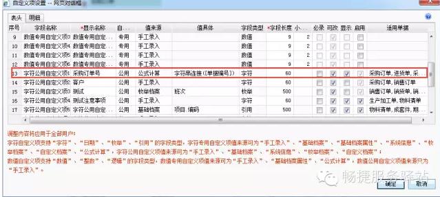 在系統(tǒng)管理-單據(jù)設(shè)置-單據(jù)設(shè)計(jì)-采購訂單-自定義項(xiàng)設(shè)置-字符公用自定義項(xiàng),值來源選擇公式計(jì)算,具體值選擇單據(jù)編號,適用單據(jù)選擇采購訂單,進(jìn)貨單,采購發(fā)票,這樣在具體單據(jù)上把這個(gè)自定義項(xiàng)顯示出來,便可以把采購訂單號帶到采購發(fā)票上了。